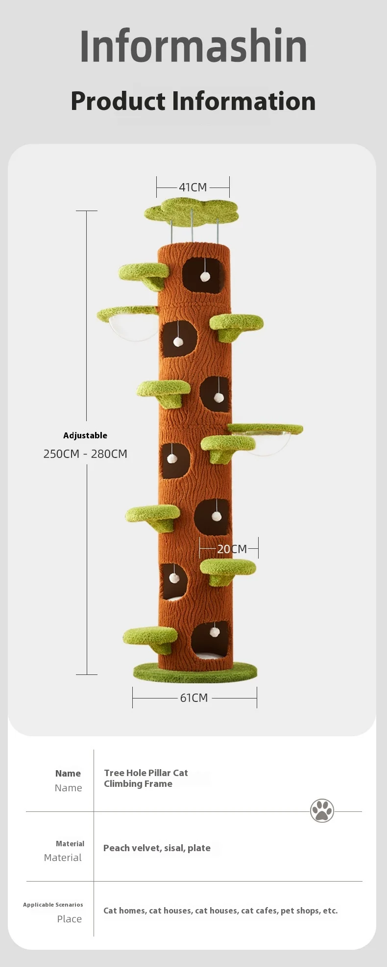Cat Tree Adjustable Height Integrated Nest Climbing